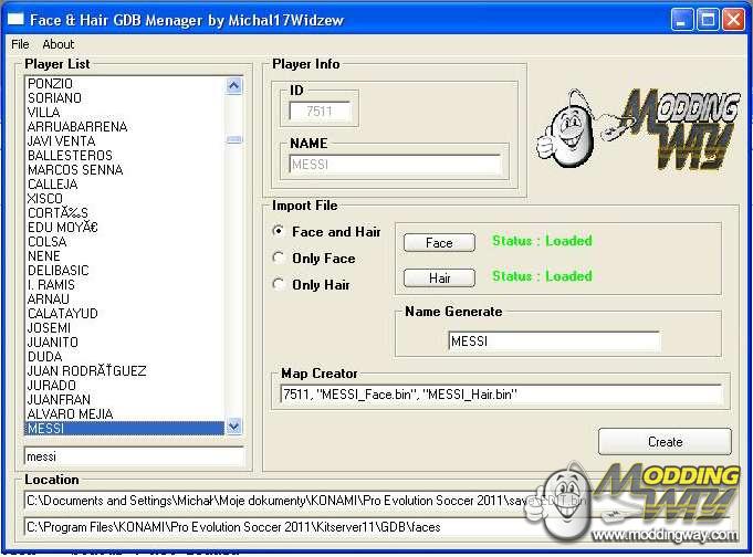 Location EditExample:C:Documents and SettingsxxxMy DocumentKONAMIPro Evolution Soccer 2011saveEDIT.bin2.Location GDBFace (Folder)Example:C:Program FilesKONAMIPro Evolution Soccer 2011Kitserver11GDBfaces