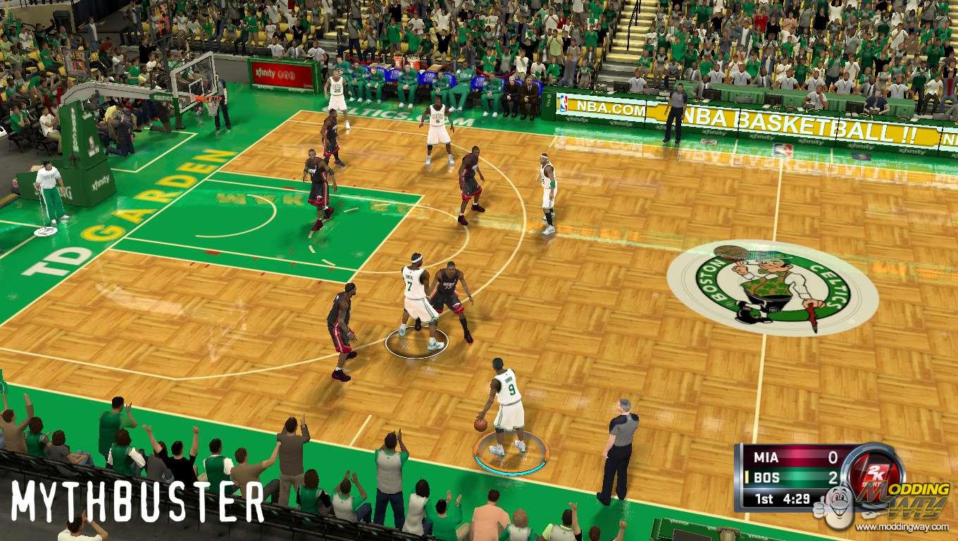 Court-Almost all textures made by me, real TD GARDEN baseline and CELTICS.COM signage, and court colors and reflections as well. Credits to the patcher who made the floor BMP texture.