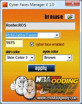 NBA 2K12 Cyber Faces Manager V 1.0 ---------------------------------------------------- www.moddingway.com HOW TO USE IT ---------------------- a) Browse and open your roster file ( .ROS ) with this tool Roster files are placed in folder : C: / Documents and Settings / USER / xxxxx / Application Data / 2K Sports / NBA 2K12 / Saves b) Select the player you would like to edit c) IMPORTANT! Every time you edit each player click on APPLY and roster file will be updated. I mean do not edit 3 players and then click apply. Edit one, click apply. Edit the second one and click apply ... Tips ----- -Select Skin Color : from 0 (dark) to 5 - to match Cyber Face Skin Color ( For instance you need a 1 for Kobe Bryant and a 5 for Ginobili ) -When you decide to enable a cyber face for a player that don´t have ticked "Enabled Cyber Face" be sure to add the png file ( cyber face ) with the same number in NBA 2K12 main folder. Credits : --------- Authors: Ariel SAntarelli Thanks to : VL@D ZOLA JR. and jor1980 Thanks to www.nba-live.com and www.nba2kmods.com Dedicated to the memory of my grandmother Lucy. 2K Sports for another fantastic game. COPYRIGHT INFO ------------------------- This software is distributed "as is". We hold harmless of any possible misconfiguration or error this program may cause in your computer. Copyright © 2011 ModdingWay Staff www.moddingway.com