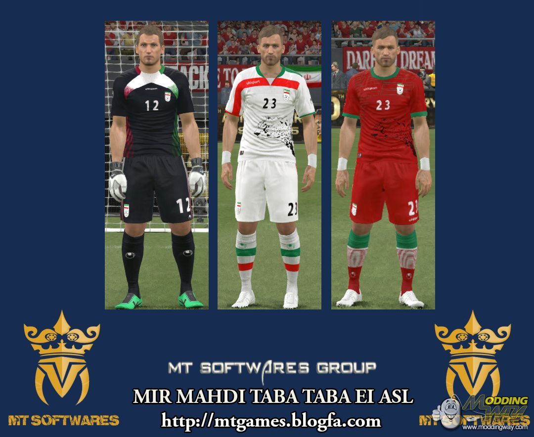 Actual Ir.Iran 2016 KIT For PES 2016 By MT GAMES 1991 (Mir Mahdi Taba Taba Ei Asl)----------------------------------------------------------Credits to:Template Kit by MT GAMESFont & Number by MT GAMESLogo Iran by Web : http://upload.wikimedia.org/wikipedia/en/9/93/Iran_Football_Logo.pngFor use the kit :Put the iranmtgames.CPK in your download folderand edit dpfilelist with DpFileListGeneratorMake BY MT GAMES 1991MT Softwares GroupEnJoY