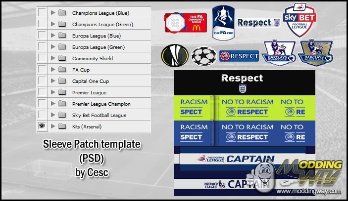 Sleeve Patch template (PSD) by Cesc especially for Premier League teams Contains sleeve patches for the following tournaments: - FA Cup - Premier League - Premier League winner - Community Shield (adjustable team colours) - Capital One Cup (only armband as in real life) - Sky Bet Football League (for Championship, League1, League2) - Champions League (blue armband) - Champions League (green armband) - Europa League (blue armband) - Europa League (green armband) Enjoy!