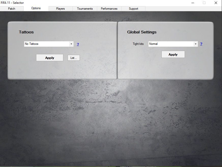 features:- FIFA 11 Selectorincluded program to change options of the patch the way you like* switchable squads (+ backup function)* change new gameplay options* change intro movie* enable/disable new music* xtra options: "run windowed" & "skip intro"* change winter settings: enable winterballs, winter accesoires* change arena: stadium, goalkeeper, ball* change scoreboards* players - change sleeves, tucked, undershorts, tight kits, sock, winter accs, shoes, ...* enable/disable Tattoos* tournament graphics: change to (Champions league, EL, WC, ...) graphics (like ball, adboards, shoes, ...)* Performances > Performance optimizer, ...* Support > Help, ...* Updater (About > Update...) : warns automaticly when new update avaible- Squads:* Official EA squad-update from FIFA 16* Leagues & teams (ea license): https://www.easports.com/fifa/news/2...gues-and-teams (Czech league removed)* New promoted teams* career & tournement: All playable leagues + new added Cups (Copa Libertadores, Saudi Crown Prince Cup, german supercup, copa argentina, ...)- Kits* all 2014-15 kits (FIFA 15 + improvements) + updated numbers & name fonts* xtra GK kits (random chosen at each match)* referee kits: english leagues, CL, EL, ...- faces:* FIFA online 3 models (= FIFA 15 + exclusive FO3)* generic faces: improved (fifa online 3)* all faces avaible online & offline (= online compatible)- Balls (full list included at download)* New league balls* winter & snow balls (hi-vis, ..)* CL ball, EL, ...- Shoes (full list included at download)+ updated assignments* correct models (nike magista "socks", ...)* assign shoes to players for specific tournaments (CL, EL, ...) with Selector- 15 new stadiums (9 playable for game):* Etihad Stadium (mancity)* BC Place Stadium (Vancouver Whitecaps)* Molton Road (generic stadium)* BayArena (only avaible for: Bayer Leverkusen)* Stade de Suisse (only avaible for: BSC Young Boys, Switzerland)* FIWC stadium* Arena da Baixada (Atlético Paranaense)* Arena Corinthians (Corinthians)* Fonte Nova (Esporte Clube Bahia) (avaible as Arena Stadium only)* Estádio Beira-Rio (Sport Club Internacional)* Mineirão (Cruzeiro EC, Atlético Mineiro)* Estádio do Maracanã (brazil national team, Flamengo, Fluminense, Botafogo, Vasco da Gama)* Arena Pernambuco (Sport Club do Recife)* Arena Amazonia WC'14 (avaible as Arena Stadium only)* Arena Pantanal WC'14 (avaible as Arena Stadium only)* Estádio Castelão WC'14 (avaible as Arena Stadium only)* Arena das Dunas WC'14 (avaible as Arena Stadium only)* Estadio Nacional WC'14 (avaible as Arena Stadium only)- Adboards* specific adboards for teams & leagues- 33.000+ new mini-faces- new banners & flags- New feature: tight kits- New feature: sock heights (high, normal, low)- new body & jersey (kit)--models (fifa online 3)- New sideline people: medics, photographers, cameraman, ballboy, police, steward, generic peoples- goalkeeper gloves- New winter-gloves: black nike- xtra goalnet-coulours* Anfield* Parc des Princes* Etihad Stadium* Estadio Vicente Calderon* ...- updated / licensed logos & names (teams, leagues, trophies,...)- New Intro & improved menus:* realife player-pictures* ...- realistic sponsers for career* Nike, ...- optional (can be turned on/off):* new gameplay (from game fifa online 3)* New scoreboards * New music * tattoos for players* Performance Optimizer- reprogrammed files (.lua files): as based on the work of scouser09 's Revolution Modmakes it possible to add new features to the game, wich are fully online compatible:* new faces (now online compatible)* kits: away/3th GK kits, specific referee kits, ...* shoe assignments: unlimited shoe-ids can be assigned (+ now online compatible)* balls: assign winter/snow balls* adboards: assign specific adboards to teams* tattoos: assign playerskins (tattoos) to players* goalnet-coulours: assign goalnet-coulours to specific teams/stadiums (+ now online compatible)* kit name-fonts: can be assigned outside the database (+ now online compatible)* arena: assign stadium & gk kit* 'classic' graphics: assign specific textures (adboards, balls, referee kits, ...) to the classic kit wich is selected* (winter) accessories improvements* ...garanteed compatibility with online mode: no missing textures, ... for other playersSupported languages: english, Czech, dutch, french, german, hungary, italian, spanish (2X), portuguese, polish, russianInstallation:1. install fifa 112. install ea patch (1.01)3. install 2015-16 patch (v0.5) for FIFA 11* run installer "2015-16 patch (v0.5) for FIFA 11 (part 1 of 2).exe"* run installer "2015-16 patch (v0.5) for FIFA 11 (part 2 of 2).exe"Notes- Selector dont start up (if u have .net 2.0) : copy included "Selector (.NET 2.0 version)" folder content to FIFA 11 folder- problems with commentaries (crashes, not appearing ingame, ...): http://www.soccergaming.com/forums/s...&postcount=481- crashes, ...: use the "i68 regenerator" (select "take care of edited files..." > go , can take some time)
