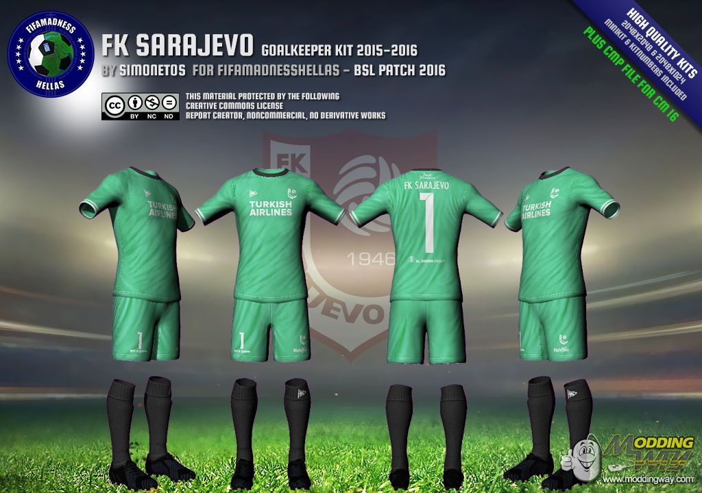 Dear friends, this is FK Sarajevo goalkeeper kit, in high quality, 2048x2048 for shirt and 1024x2048 for shorts, in RX3, DDS and CMP file format. Minikit and kitnumbers included.CMP CASEIn case you want to install this kit using CMP file, you'll need Creation Master 16 from here.RX3 & DDS CASEIn case you want to install this kit manually, using RX3 and DDS files, just extract the zip file and take the files you want.Kit files goes to "Origin Games\FIFA 16\data\sceneassets\kit" folder.Minikit files goes to "Origin Games\FIFA 16\data\ui\imgAssets\kits" folder.Kitnumber files goes to "Origin Games\FIFA 16\data\sceneassets\kitnumbers" folder.Note: Don't forget to regenerate using FHL BH EDITOR from here...... CREATIVE COMMONS LICENSE This material created by Simonetos - fifamadnesshellas.netand protected by the following Creative Commons License. ATTENTION!!! This material offered to you for personal use only.If you interested to use it in any kind of public patch, please first contact with author here!!!