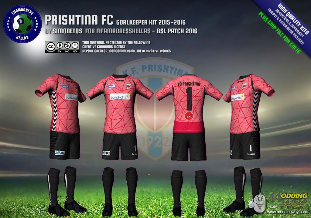 Dear friends, this is Prishtina FC goalkeeper kit, in high quality, 2048x2048 for shirt and 1024x2048 for shorts, in RX3, DDS and CMP file format. Minikit and kitnumbers included.CMP CASEIn case you want to install this kit using CMP file, you'll need Creation Master 16 from here.RX3 & DDS CASEIn case you want to install this kit manually, using RX3 and DDS files, just extract the zip file and take the files you want.Kit files goes to "Origin Games\FIFA 16\data\sceneassets\kit" folder.Minikit files goes to "Origin Games\FIFA 16\data\ui\imgAssets\kits" folder.Kitnumber files goes to "Origin Games\FIFA 16\data\sceneassets\kitnumbers" folder.Note: Don't forget to regenerate using FHL BH EDITOR from here...... CREATIVE COMMONS LICENSE This material created by Simonetos - fifamadnesshellas.netand protected by the following Creative Commons License. ATTENTION!!! This material offered to you for personal use only.If you interested to use it in any kind of public patch, please first contact with author here!!!