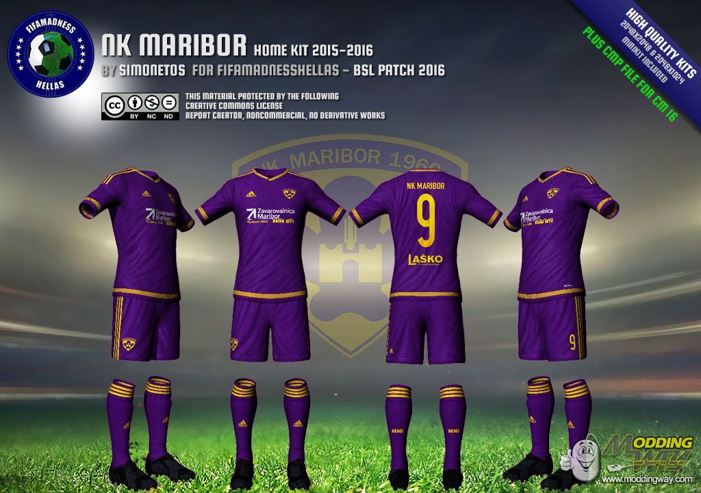 Dear friends, this is NK Maribor home kit, in high quality, 2048x2048 for shirt and 1024x2048 for shorts, in RX3, DDS and CMP file format. Minikit included.CMP CASEIn case you want to install this kit using CMP file, you'll need Creation Master 16 from here.RX3 & DDS CASEIn case you want to install this kit manually, using RX3 and DDS files, just extract the zip file and take the files you want.Kit files goes to "Origin Games\FIFA 16\data\sceneassets\kit" folder.Minikit files goes to "Origin Games\FIFA 16\data\ui\imgAssets\kits" folder.Note: Don't forget to regenerate using FHL BH EDITOR from here...... CREATIVE COMMONS LICENSE This material created by Simonetos - fifamadnesshellas.netand protected by the following Creative Commons License. ATTENTION!!! This material offered to you for personal use only.If you interested to use it in any kind of public patch, please first contact with author here!!!