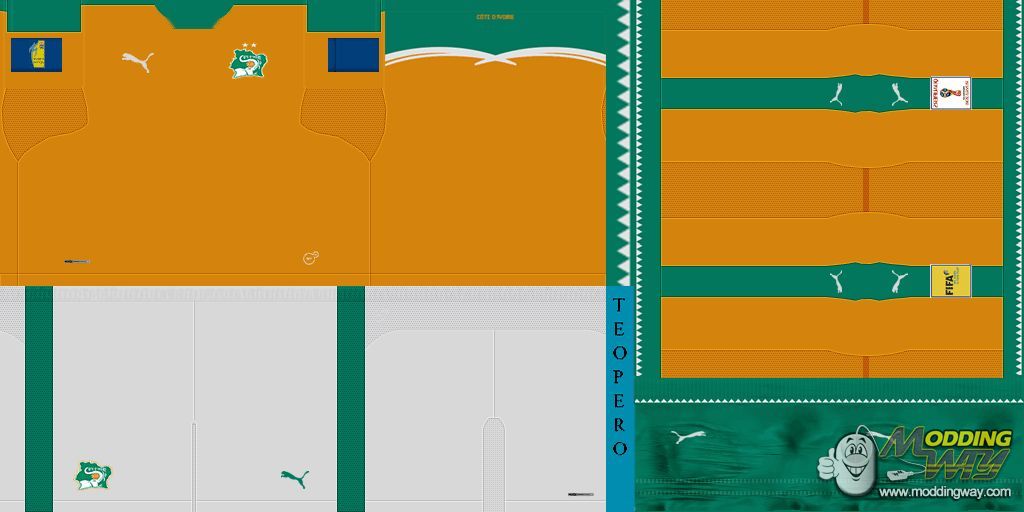 Download Ivory Coast 2017 home kit + Ghana and Cameroon gk kits. This is a mod for Pro Evolution Soccer 2013 video game.