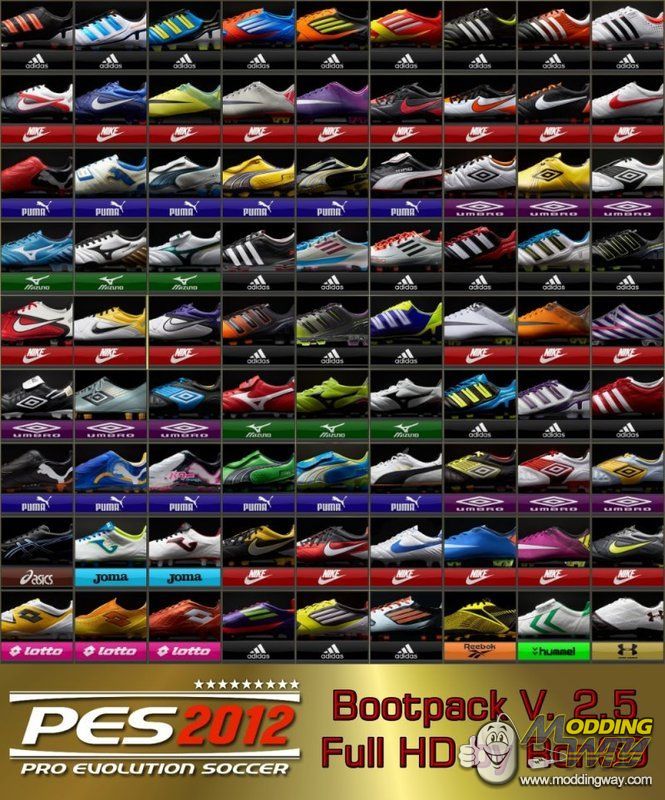 - actually and classic Boots (81 Boots)- no Fake Boots- new Boots: adizero miCoach, adiPure 11Pro, Puma King SL and more- NEW BOOTBRANDS!- the best Boots from the best Bootmakers- for PES edit Patch 2.7 (correct Bootposition)- compatible with all Patches- compatible with the last KONAMI Update and DLC Version 2.0- all Boots in HD- correct Bootnames / Color and Stats ( Quelle: Soccerbible.com)CREDITS: all Bootmaker and Boot-Eediter of the PES World!Installation: Copy all Folders in this Pack in the Kitserver IMG Folder. Overwrite existing Files, done.