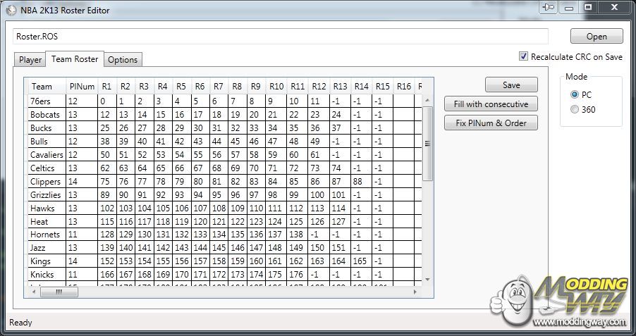 v0.12.0.3 - LastJerseyID will be recalculated each time a roster is loaded v0.12.0.2 - Fixed pasting functionality for some columns in Players table - Players table filter can be removed by clicking on Filter in the Find & Replace dialog with an empty Find column v0.12.0.1 - Pasting TeamID1 & TeamID2 now works v0.12 - Added TeamID1 & TeamID2 - Added the following read-only columns to Players table * AssignedTo: Shows you which team this player is assigned to in the Teams table * IsFA: Tells you if the player is in the FA pool * IsHidden: Tells you if the player is in no teams, nor the FA pool - Added Filter feature to Find & Replace dialog which filters the players table according to the specified filters v0.11.0.2 - Free Agents Pool expanded to 512 spots, since 256 were too few; may need further expansion v0.11.0.1 - Fixed automatic roster reordering & PlNum correction bug v0.11 - Added jersey neck & sock color - Added "Apply Replace Filters" feature which applies the replacements based on all the "Find & Replace" filters in a specific folder - Fixed color handling in Jerseys tab, colors should now show and be applied correctly - Fixed a mistake in the order of the Hot Spots - Fixed bug that caused edits to some cells in tables not to save when pressing Tab to switch to the next cell - Fixed color selection dialog showing up on non-related double-clicks on the tables v0.10.2 - Jersey GID and Names added, courtesy of Hyperballer21 v0.10.1 - Added "ChooseNameBy" option to allow user to have a "names.txt" with a first column that's not Player ID, but any column of the Players table - Fixed paste crash bug in Players table v0.10.0.1 - Fixed hang when saving players v0.10 - Added Height, Weight, Skintone, Hair Color, Eyebrows, Moustache, Facial Hair Color, Beard, Goatee - Added Dunk Packages, Signature Shot Form & Base, Signature Free Throw - Added team names for all 90 entries (courtesy of Hyperballer21) - Fixed Find & Replace ignoring the last player in the Players table v0.9.0.1 - Fixed checksum not being updated when saving Jerseys in PC mode v0.9 - Added Find & Replace functionality for Players tab - Added Last Team ID option to force the Teams tab to show more roster entries - Added automatic Check for Updates on start-up v0.8.1 - Added Player Contracts - Fixed Jersey editing on the 360 - Fixed Muscle Tone and Body Type editing - Fixed a bug that caused hex values of shoe colors not to update in the table after editing v0.8 - Added Shoe Colors - Added Jersey Colors v0.7.2 - Added Assistant Coach to Teams tab - Fill with consecutive works for 76ers again - Teams table now parses data automatically when pasting v0.7.1 - Added CAP Hair Type, Eye Color, Muscle Tone, Body Type, Jersey Number - Shoe Brand and Shoe Model and all parameters added in this release are pastable v0.7 - Shoe Brand and Shoe Model are editable - Audio ID has been discovered by DukeW74 to actually be ASA ID v0.6.1 - Support for MyCareer saves (*.CMG) v0.6 - Support for Association saves (*.FXG) v0.5.2.4 - Tool will now skip any pasted rows that have Player IDs that can't be parsed (e.g. rows with no Player ID set, empty rows, etc), instead of stopping the paste; all such errors will be silently logged to "tracelog.txt" as well v0.5.2.3 - Fixed bug introduced in 0.5.2.2 that caused tool to crash when pasted data lacked one or more columns v0.5.2.2 - When pasting, erroneous data in a certain column will not change the value at all - Silent errors will now be logged in the "tracelog.txt" file under "My DocumentsNBA 2K13 Roster Editor" v0.5.2.1 - Fixed pasting Audio ID v0.5.2 - Audio ID added to Players table v0.5.1.2 - Fixed Hot Spots overwriting Tendencies when pasting to the Players table v0.5.1.1 - Fixed various bugs that would cause the tool to crash or misinterpret data when pasting into the Players and Teams tables v0.5.1 - Ratings, Tendencies and Hot Spots columns now are named - Copy-pasting for the Players table should work completely v0.5 - Players and Options tab are now spreadsheet like as well - Ratings, Tendencies and Hot Spots added to Players - Teams' PlNum and Player Order will automatically be fixed on save - Now the user can change the name of the file to load Player names from, to allow for multiple files v0.4.1.1 - Fixed bug that would substitute the FA pool with the Bobcats players on save v0.4.1 - The tool will now read and write 18 roster entries instead of 15 for every team v0.4 - Added roster editing for all 30 current teams and the FA pool v0.3.3 - Fixed player entry reading after Player ID 1365 in X360 rosters - Known Issue: (X360) Editing Signature Skills of Jamaal Magloire on Player ID 1364 doesn't work for now - If you have a "names.txt" file in your "My DocumentsNBA 2K13 Roster Editor" with tab-separated Player IDs and names, the tool will now show you the name of the player you're editing v0.3.2.3 - Tool no longer crashes when Search by CF doesn't find a player with that CF ID v0.3.2.2 - Fixed bug with CF reading/writing introduced in v0.3.2.1 v0.3.2.1 - Fixed bug with PlType not being read correctly v0.3.2 - Added PlType editing (PC & X360) v0.3.1 - Added support for GenericF editing (PC & X360) - Added error reports v0.3 - Added support for CF ID & Portrait ID editing (PC & X360) - Added Search by CF feature v0.2.6 - Added X360 support for the Signature Skills editing v0.2.5 - Added X360 support for the Team Roster editing v0.2.4 - All 12 player IDs of the 76ers can be changed v0.2.3 - Added changing the Player ID of the 5th player of the 76ers to test out different Player IDs v0.2.2 - The offset of the current player's first signature skill is shown - Buttons to switch players quickly have been added v0.2.1 - Added Gatorade Prime Pack and On Court Coach signature skills v0.2 - Tool can now save changes to roster files v0.1 - Initial release