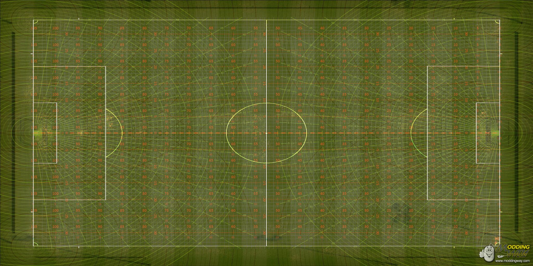 This Mapped Turf is a modified version of the standard PES 2013 training football pitch that is contained in dt07.img file inside the PES 2013 installation folder (PC version). The original image was accurately measured and scaled, then multiple graduated layers were overlapped in order to mark distances and angles all over the playing area.