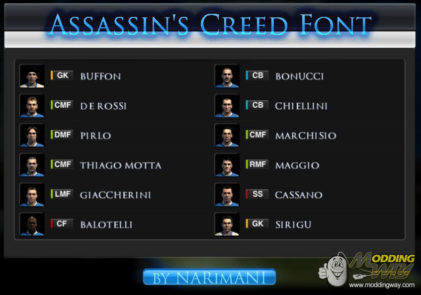 Download Assassin's Creed Font. This is a mod for Pro Evolution Soccer 2013 video game.