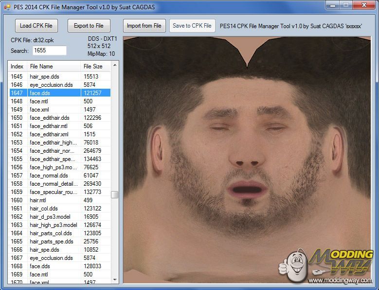 v1.1 Features;* Compatible with PC Platform (supports both PC and Console)* Search Files with filename* More fast and stable* Fixed some small bugs* Download from same below linkHere is an alternative tool for new *.cpk files, It's my simple 'CPK File Manager Tool' for pes14 *.cpk archive files, its my simple analysis tool for search/analysis game files, I've designed it as 'indexed file list (old style)' and it includes generic game tool features;* Fast loading *.CPK files* Easy'n'Fast file find/access with indexed file list (old style)* Auto-ZLib Compress/DeCompress* Import/Export all of game files* Supported texture types; DDS,PNG* Better Texture Preview* Auto-Expand file slot when importing big files* Support Console version (I will update it when PC game released)* File Hex-edit with external editor (put your hex-editor path into config.ini)* Decode/Encode *.cpk files properlyAuthor: Suat CAGDAS 'sxsxsx'Special Thanks: jenkey1002 (for decoding cpk file headers)