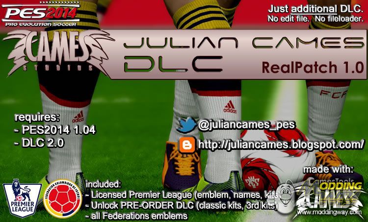 requires: - PES2014 1.04 - DLC 2.0 included: - Licensed Premier League (emblem, names, kits) - Unlock PRE-ORDER DLC (classic kits, 3rd kits) - all Federations emblems - Some national kits Credits: - All KitMakers - PESEDIT (EPL dorsals, some EPL kits) - Jenkey's LogosCreator - Julián Cames Tools How to install: 1. Make a backup of the files EDIT.bin(DocumentsKONAMIPro Evolution Soccer 2014save) and DpFileList.bin(C:ProgramDataKONAMIPro Evolution Soccer 2014download) 2. Remove EDIT.bin from your documents (DocumentsKONAMIPro Evolution Soccer 2014save) (for apply team names) 3. Install Julian Cames DLC 4. Enjoy! juliancames.blogspot.com