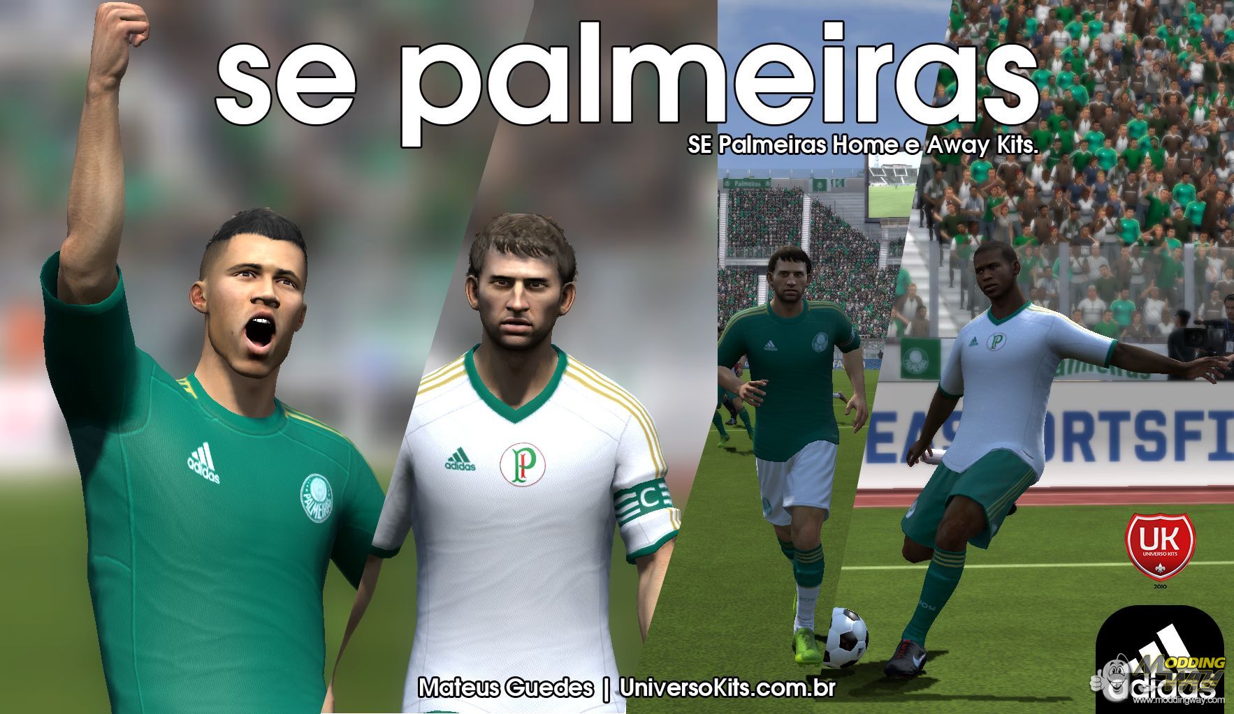 As novas camisas do SE Palmeiras feitas pela Adidas para o ano do centenário do clube.A adidas preferiu usar templates simples para não "encher" de detalhes a belíssima camisa do Verdão.A camisa numero 1 é toda verde com gola redonda e as já tradicionais listras da fornecedora alemã em dourado. Calções e meiões brancos completam o uniforme nº 1.Já a camisa 2 é totalmente branca com exceção da gola em formato V e barra das mangas que são na cor verde. O uniforme 2 ainda conta com calção e meião verde.