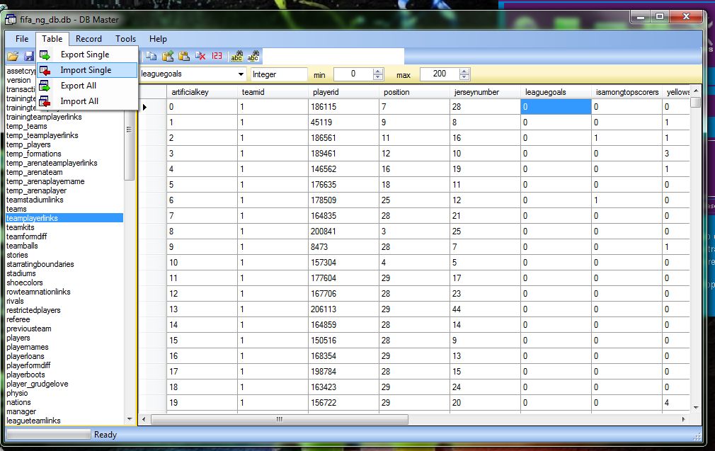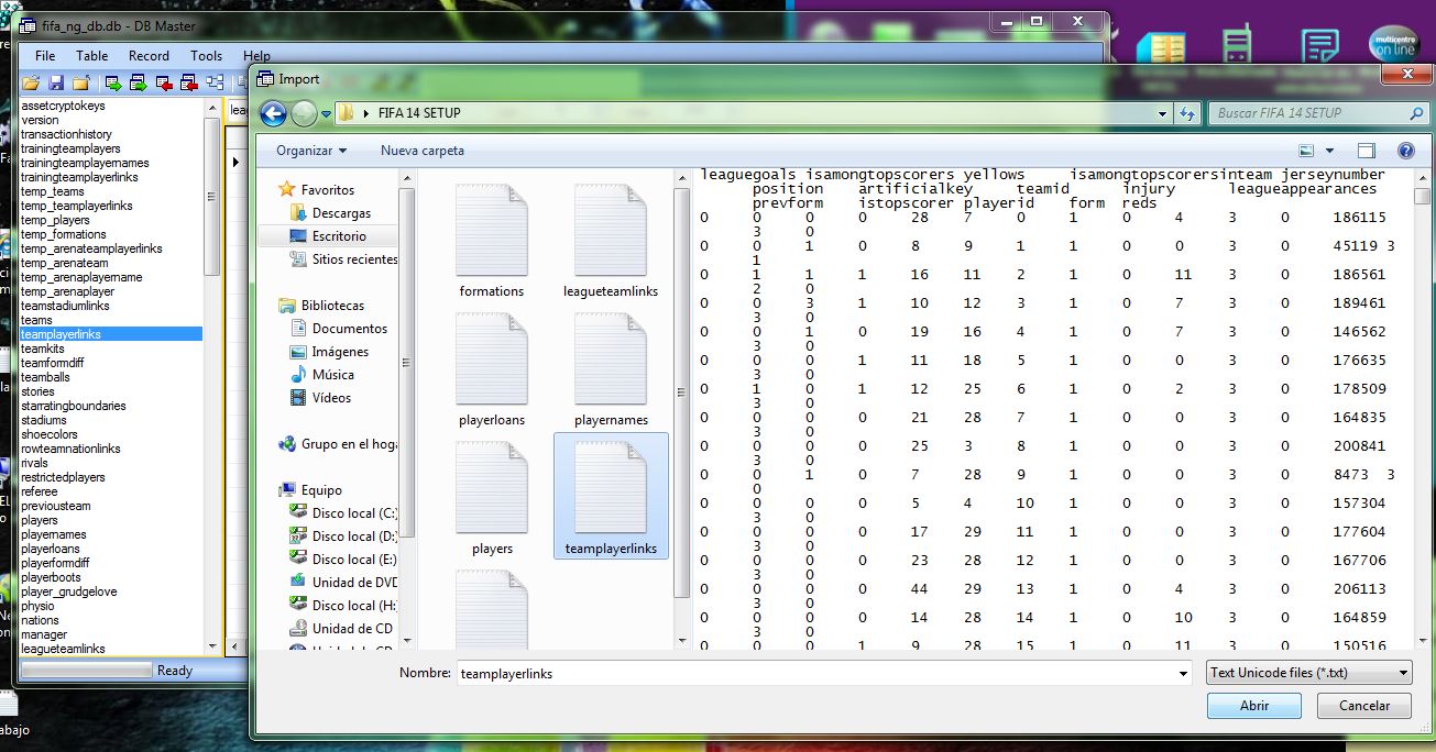 1 -. Downloading and extracting files. 2 - select the database 4.0 of moddingway selector. 3 - open fifa 14 db master (if you have to download and install) open the database of fifa 14 Search and Select teamplayerlinksgo to the Table menu and give selecionan Import Single select teamplayerlinks downloaded files that give so do savefiles do the same with the other files.