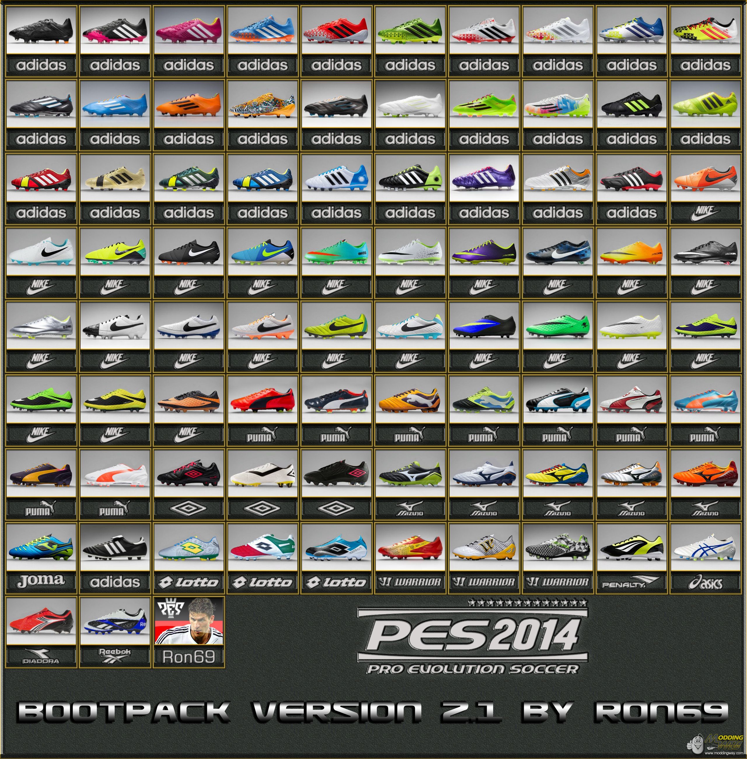 - 82 Boots - compatible with PES edit Patch 3.0 - compatible with other Patches ( not tested) - new Boots added / updated - new Bootpreviews - new Bootbrands (Messi and Ronaldo) - required the last FileLoader (not included) - required and works only with KONAMI Update 1.04 and DLC 2.0 - correct Bootnames, Materials and Colors Install: Load and install Tool FileLoader. Copy the folder in the RAR Archiv in the Folder "FileLoader". Overwrite existing Files and Folders. CREDITS: WENS, Qinchao, scp4eva, thetrinity12, saks07, PES edit, Fire Patch, MartyMcFly and all Bootmaker BIG THANKS to scp4eva and thetrinity12 for his support I hope, you like it