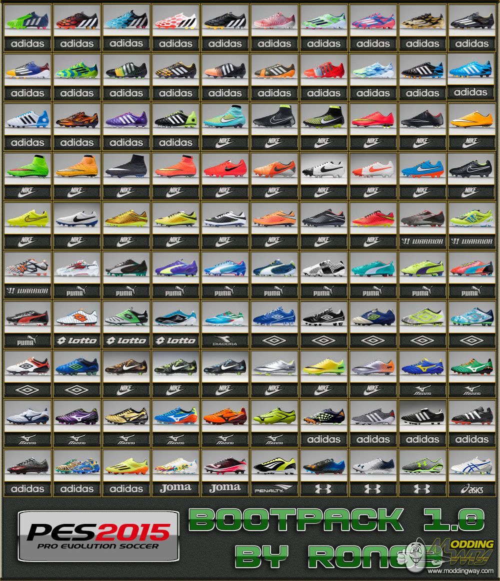 - 100 current and classic boots- over 90 % PES 2014 Boots (not all Boots completely compatible with PES 2015, minor variations of the representation in the game)- works with original Game without Tools- new Previews- new PES 2015 Texture by SGangster ( Superfly green and CR7)- original Konami Boots: Superfly red and yellow, Magista)- correct Bootnames, Bootbrands and Colors (source: Konami, ProDirect and footyheadlines)Credits: boonaun, Qinchao, Konami, WENS, thetrinity12, kevin_cd, saks07, scp4eva, PES edit, MartyMcFly and all Bootmaker / EditerSpecial thanks to: boonaun for the 100 Boots unlock MOD and thetrinity12 (SGangster) for the excellent cooperation, help and support.Install notes1. Make a backup from the File "DpFileList.bin" or or create a backup of the complete download folder. The download folder is in the root directory of the game2. Copy the Folder "download" in the Root Folder of the game. Overwrite existing files3. Play the Game4. EnjoyThe Bootpack works 100% with the original Game without Tools. Bootpack tested with Pes 2015 Version 1.01 / DLC 1.0