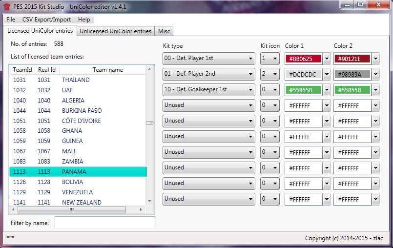 · Open the Unicolor.bin with the program PES 2015 Kit Studio v1.4.1 and copy the data from the picture Unicolor Panama.