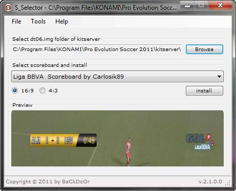 Requirements:• Kitserver by Juce• Microsoft .NET Framework 4New Features:• Add function imports scoreboard (20)• Fix tool (restore to default)Features:• Scoreboard Selection.• Auto Update.• Support for all patches.• Available in two resolutions.• Preview of the Scoreboard.• Save settings.• Add function imports scoreboard (20).• Fix tool (restore to default).Credits:• Liga BBVA Scoreboard by Carlosik89.• EPL HD Scoreboard by Jenkey1002.• FSC Serie A Scoreboard by Marthchyld.• Bundesliga Scoreboard by Marthchyld.• Ligue 1 Scoreboard by jason_y.• Eredivisie Scoreboard by Carlosik89.• Canal + HD Scoreboard by Txak.•Canal + Liga Scoreboard by Txak.•Gol TV Scoreboard by Txak.• La Sexta HD Scoreboard by Txak.• TVE Scoreboard by Txak.• ESPN Scoreboard by Jenkey1002.• Sky Sport HD Scoreboard byRon69.• BBC HD Scoreboard by Hicksville.• Real Madrid TV Scoreboard by Carlosik89.• Barca TV Scoreboard by Carlosik89.• FIFA 2011 Scoreboard by Carlosik89.• Champions League Scoreboard by Mehroo.How to use:• Select folder dt06.img of kitserver.• Select scoreboard and install.How to imports scoreboards:• Select free slot in combobox.• Select scoreboard name.• Load bin files 4:3 / 16:9 / Both.• Load picture png resolution 800x100.• Save.