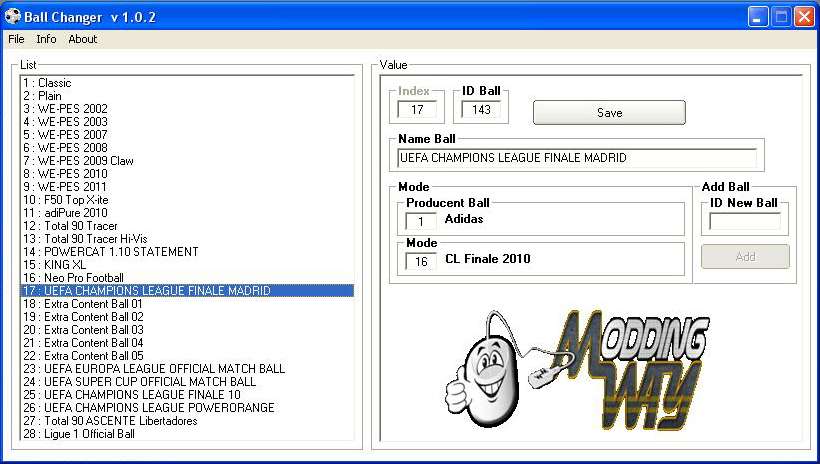 Thanks for Downloading! www.moddingway.com Please give credits to ModdingWay.com Thanks for your support. Autors : MichaÅ‚17Widzew Always helpful : (Anasie10, Ariel Santarelli,Omar Ahmed,Kenny,youssefock) Copyright 2011 © version 1.0.0.2 -Edit ID ball -Edit Name Ball -Edit Producent -Edit Mode -Add Ball Option